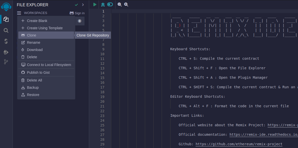 With the "File explorer" tab selected on the left sidebar, click the hamburger button and select "Clone".